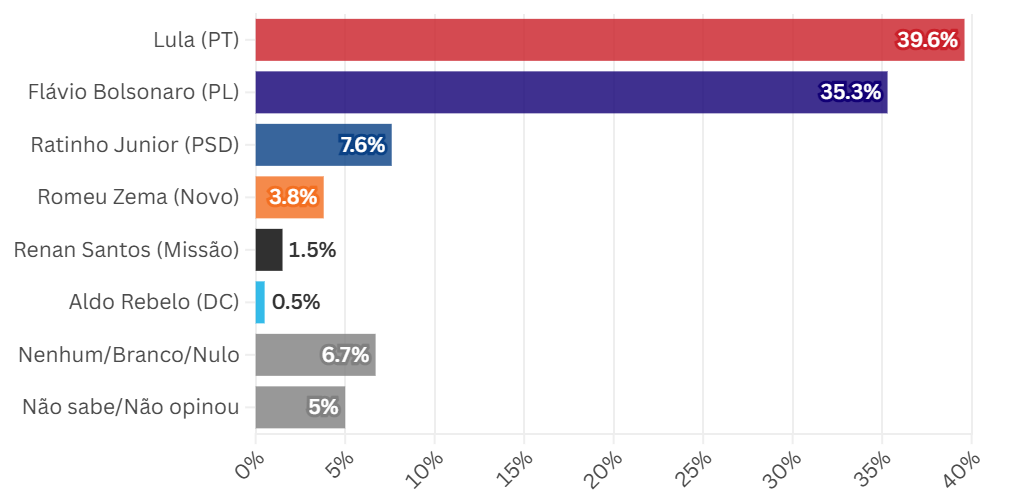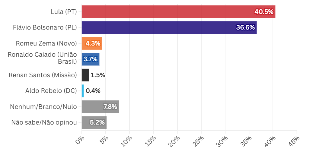 Já para o segundo turno, em um cenário de Flávio vs. Lula, Flávio aparece numericamente à frente pela primeira vez, com 44,4% contra 43,8% de Lula.