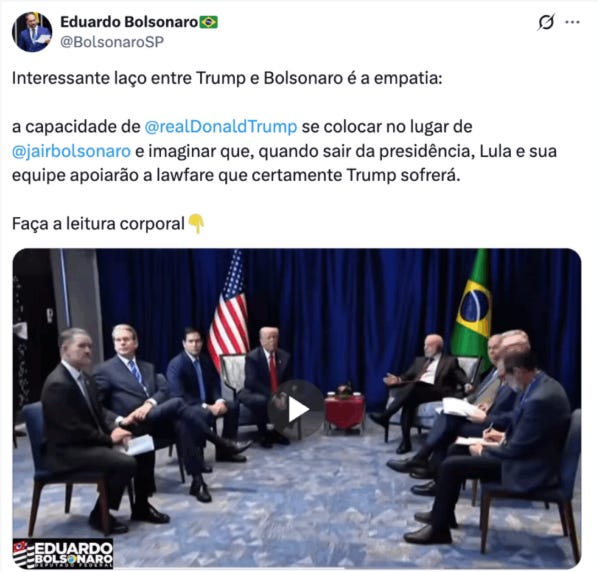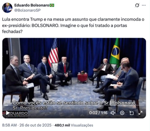 Representantes da oposição e os filhos de Bolsonaro, Eduardo e Flávio, fizeram tweets ironizando o encontro. Eles destacaram o elogio de Trump a Bolsonaro e afirmaram que Lula “não saiu com o que esperava”.